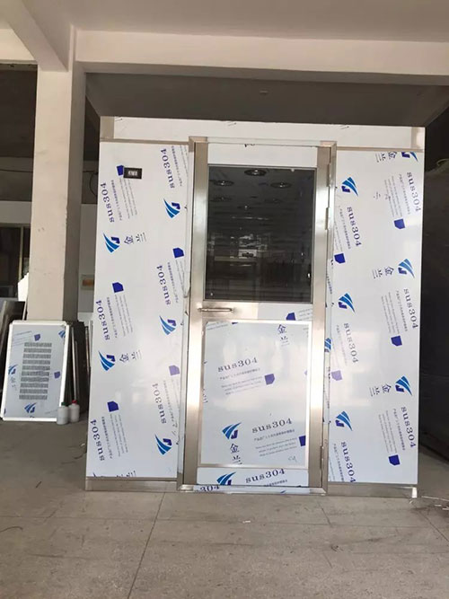 3.出入口采用不銹鋼結(jié)構(gòu),采用三角形1.2mm SUS304不銹鋼,上部為鋼化玻璃窗,下部為不銹鋼防撞門板;配德國進(jìn)口gezer閉門器或日本進(jìn)口GMT閉門器(帶德國domar閉門器)。門框結(jié)合平整,牢固,美觀,密封性能好,門開啟靈活。車間的空氣淋浴是一個(gè)單獨(dú)的自動(dòng)門(參見打開方向的布局);潔凈室風(fēng)淋室為手動(dòng)門。