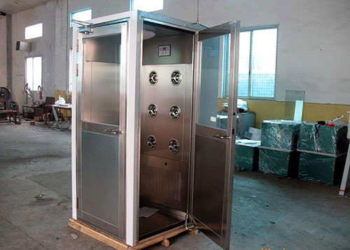 風淋室由低噪音風扇和多個機翼組成。來自風淋室門的空氣通過預過濾器被吸入靜壓室,然后通過空氣過濾器擠出。凈化的空氣從盒子的左側和右側高速排出,并且將人體上的灰塵吹走。然后通過風扇將空氣吸入預過濾器,并通過過濾器吹出噴嘴,該循環達到了除塵的目的。